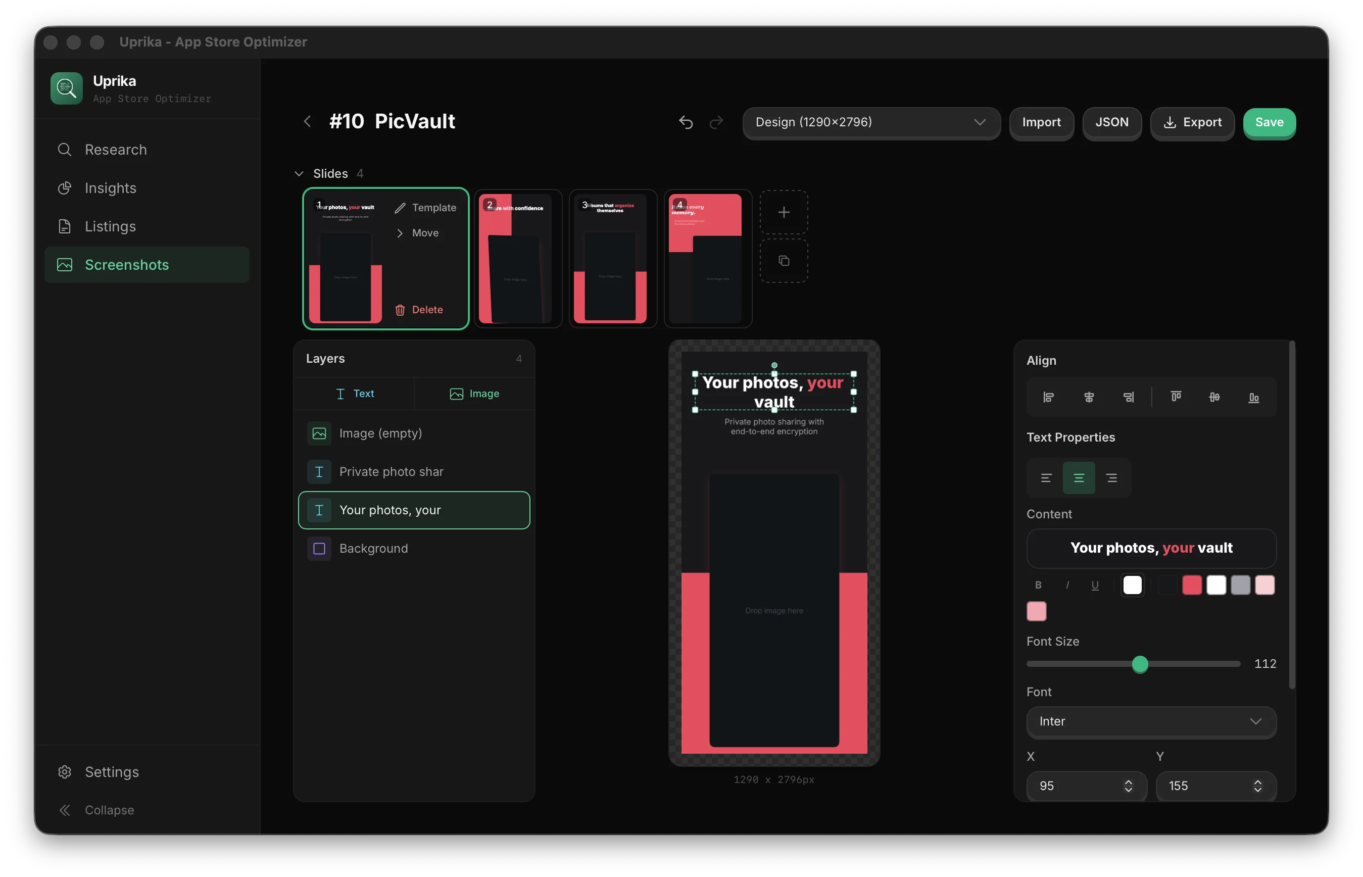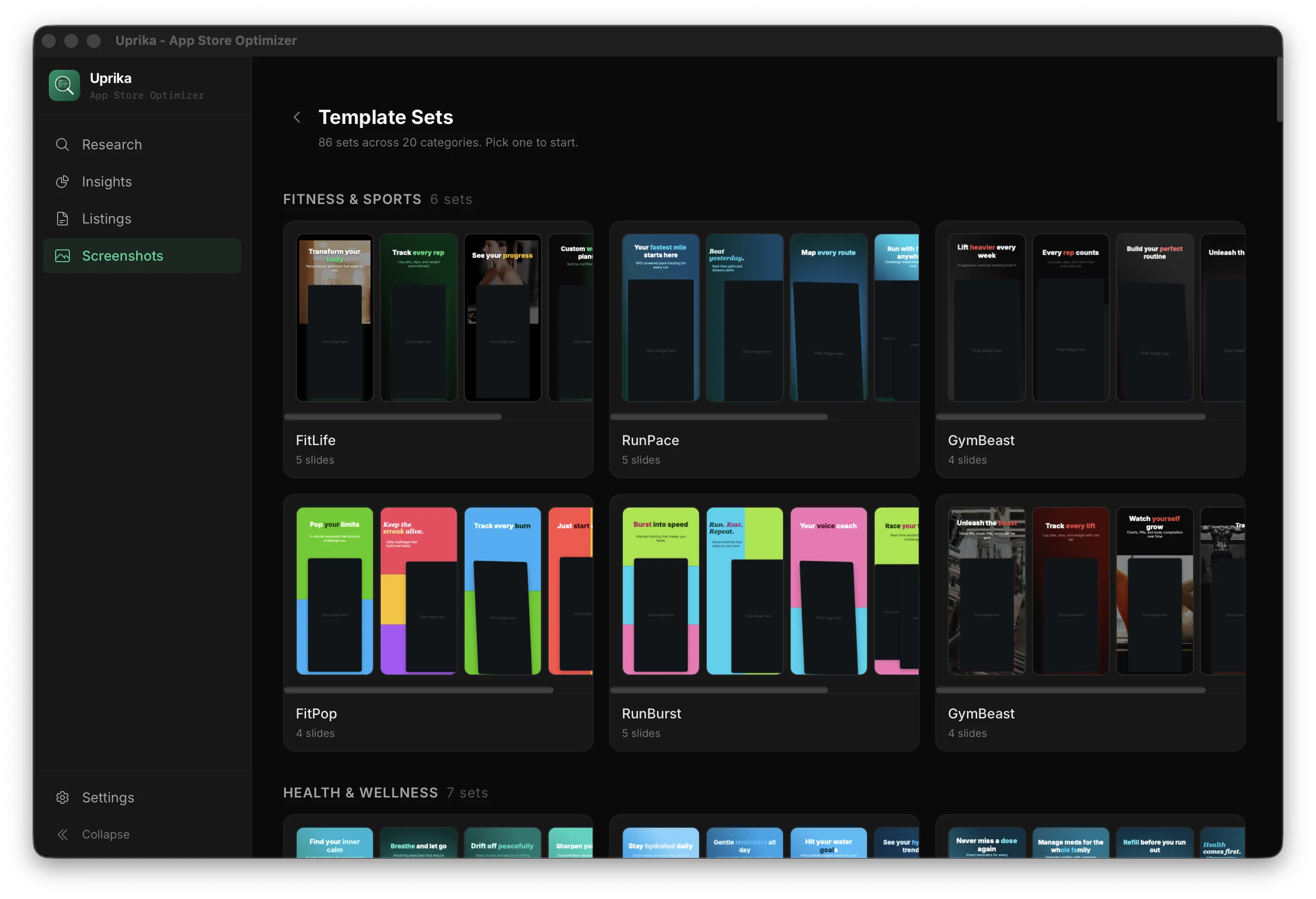Visual editor with templates. Create professional screenshots with AI-generated text and one-click export.