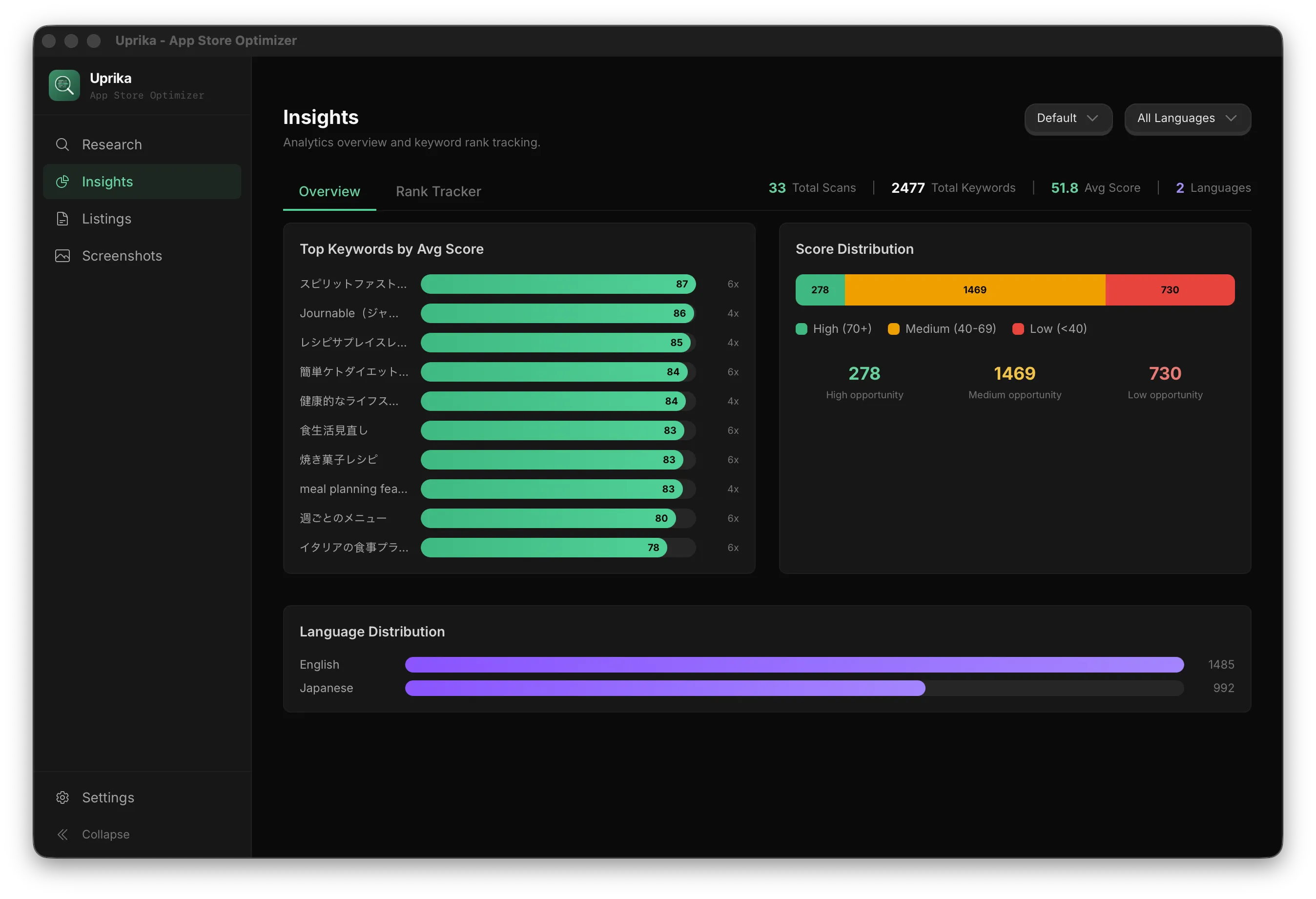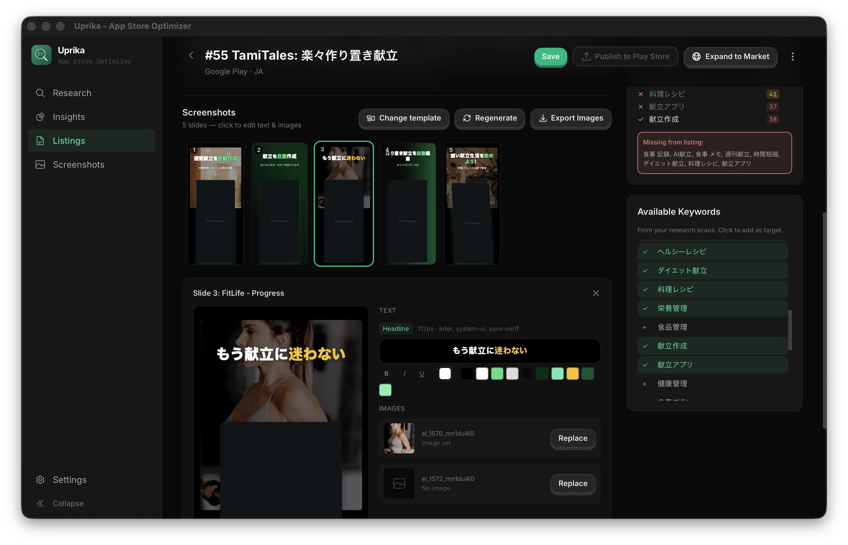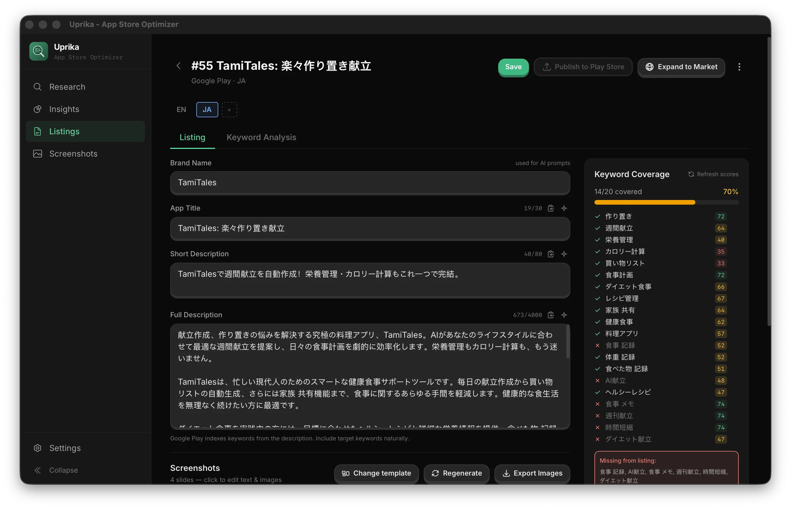 One-click expand to any language. AI translates your listing, keywords, and screenshot text for new markets.
