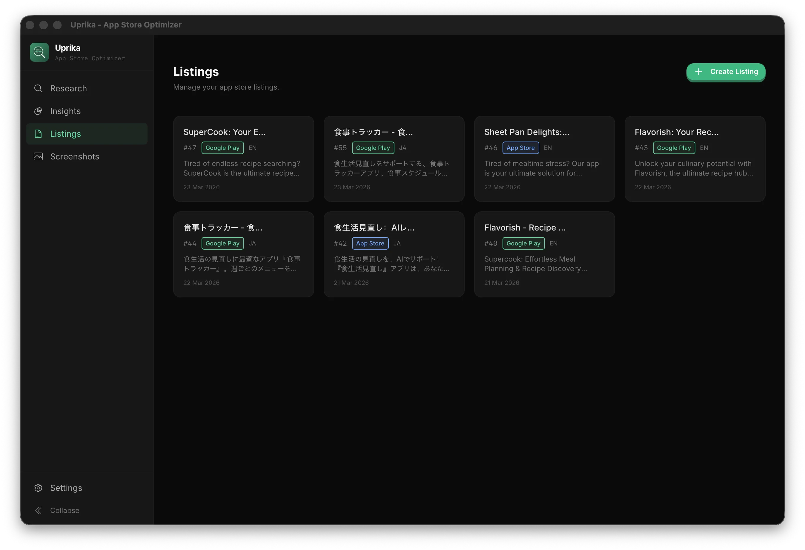 Discover untapped keywords, generate optimized listings, build stunning screenshots — then publish directly to Play Store and App Store. All from one desktop app.