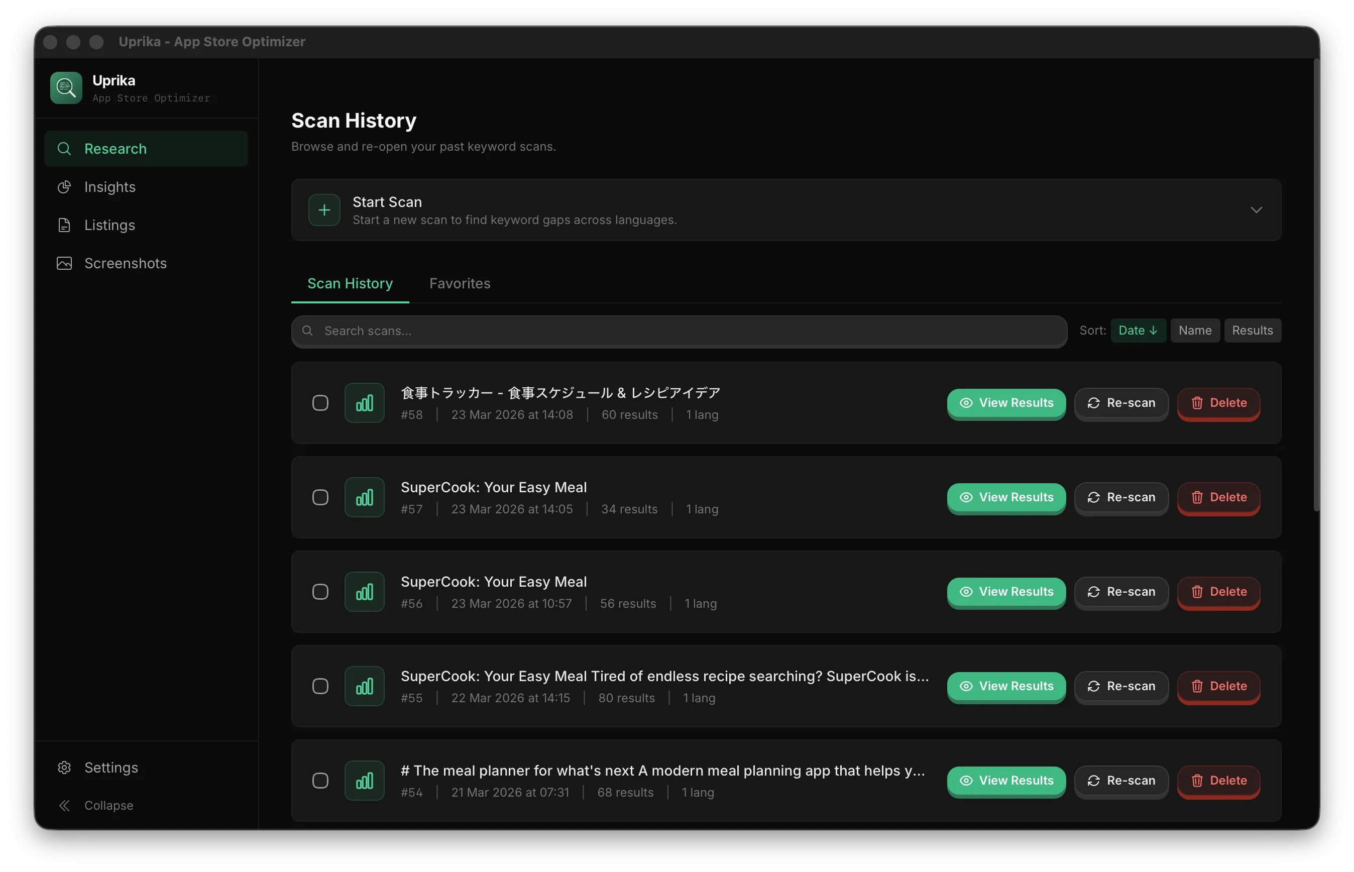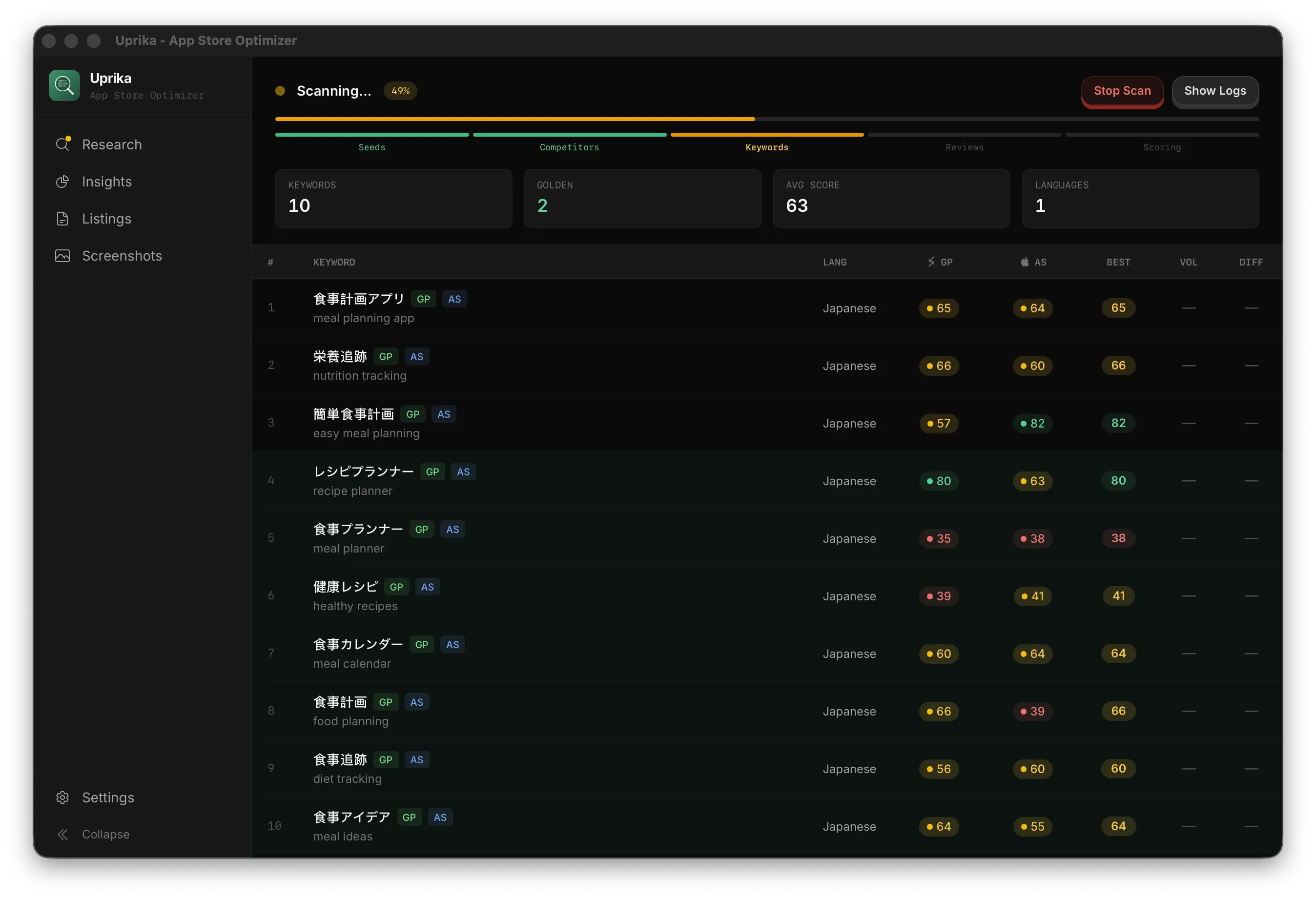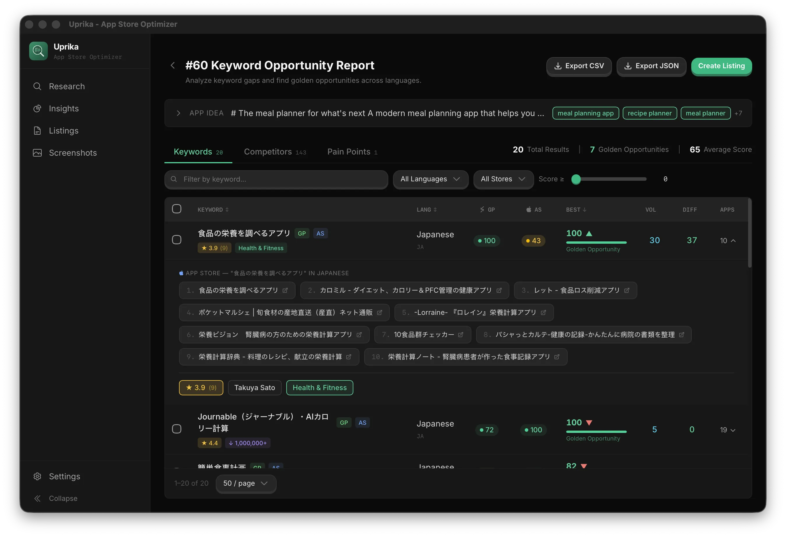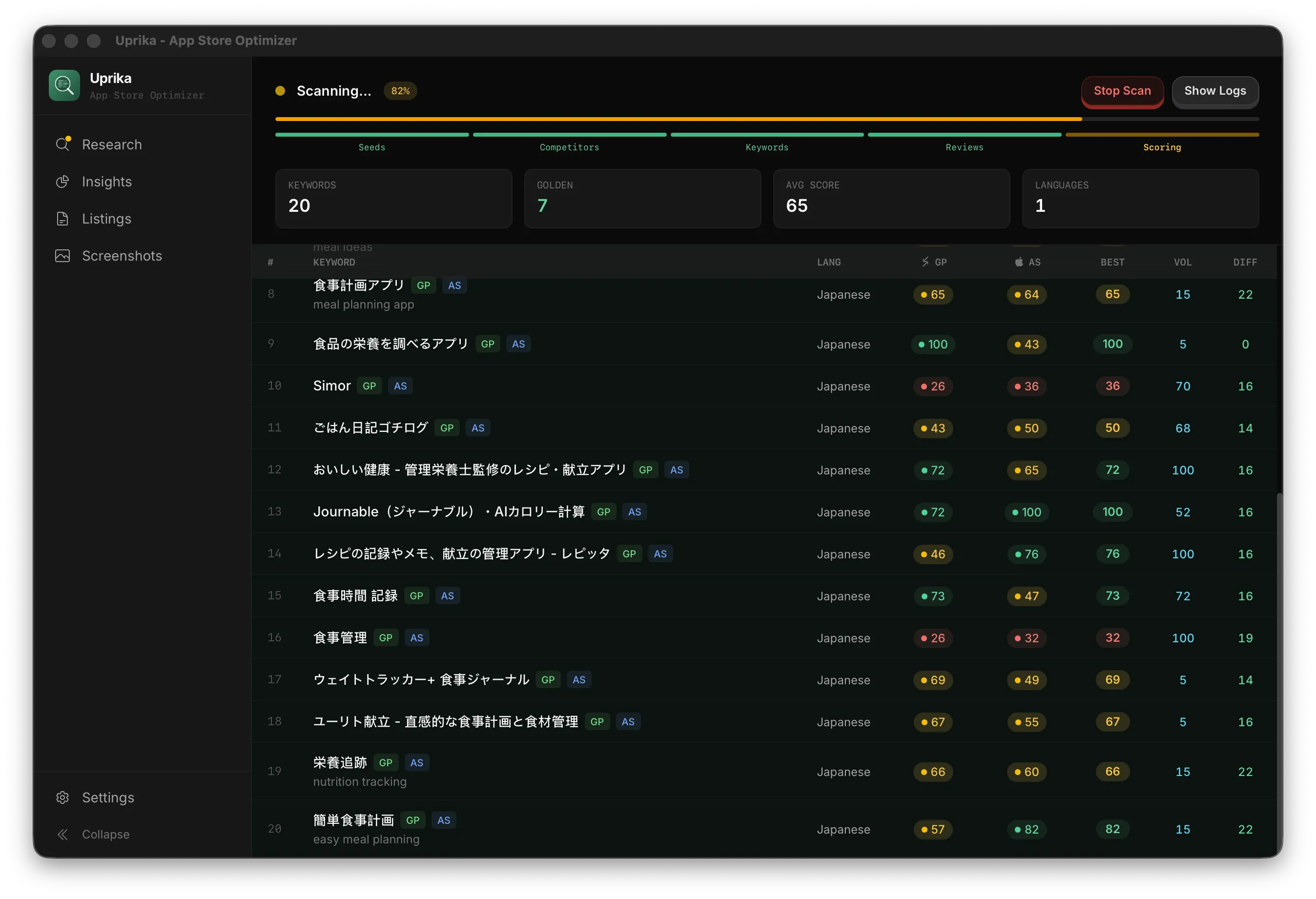 Enter your app idea, paste a URL, or provide custom keywords. AI brainstorms seed keywords, then scrapes real App Store and Google Play data to score each opportunity.